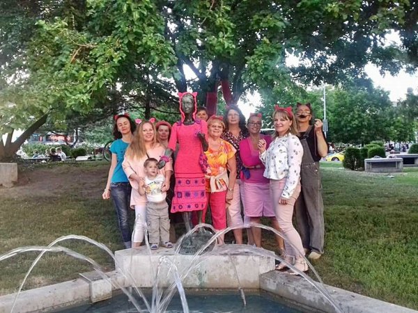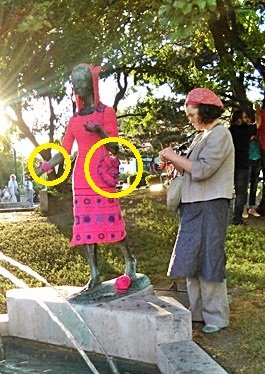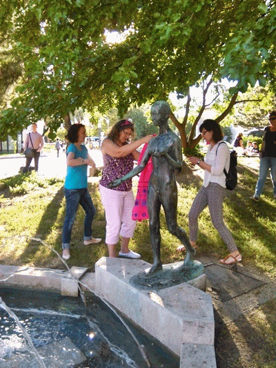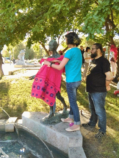 Szomorú utóirat: csütörtökön öltöztettük fel a kislányt, és hétfőre eltűnt a ruha. Megélhetési bűnözés? Intézkedett a hatóság? Egy Trump-rajongó bosszúja? Vagy csak szimpla rosszindulat? (Lásd még Piedone-graffiti). Bármi volt is a motiváció, szomorú képet fest hogylétünkről.