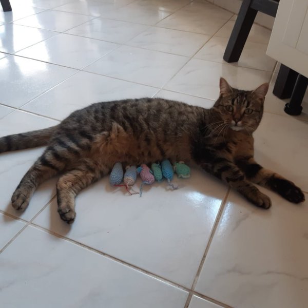 Karácsonyra megint minden ismerős cica kapott egeret. Íme az egyik versenyző.